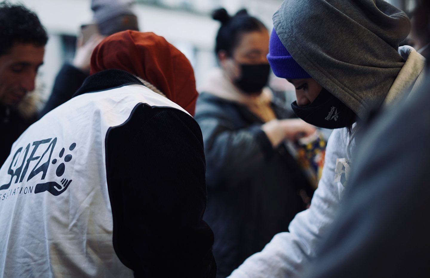Distribution de produits de première nécessité tels que des protections menstruelles, dentifrice, savon, etc., lors de maraudes régulières en Île-de-France.